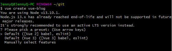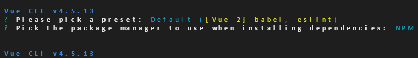 I'm creating a basic app using Vue CLI. This quickly creates a new app for you. If you're like me, and you are using Git Bash as your main terminal on windows, don't use it for the initial install. For some reason, the arrows keys don't work when these preset options appear.
